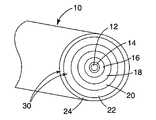 FIG. 1 shows anoptical fiber10 constructed in accordance with the present invention.Optical fiber10 includes aprotective coating20 and abuffer30.Optical fiber10 further includes a core12,inner cladding14, and anouter cladding16. Thecore12, theinner cladding14, and theouter cladding16 are exemplarily constructed of glass, but may also be constructed of any suitable material. Thecladdings14 and16 also may be constructed from materials other than glass, such as fluoropolymers, fluoroelastomers, and silicones. Oneadditional glass layer18 concentrically surrounds the glass core and claddings. Thelayer18 is the original support material collapsed from the initial preform tube, generally comprising silica glass.