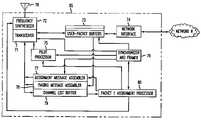 FIG. 9 is a functional block diagram for dynamic packet assignment for a wireless station WS according to the present invention. Wireless station WS can be mobile or fixed. Wireless station WS includes anantenna90, atransceiver91 having afrequency synthesizer92, a user-packet buffer93, auser interface94, an FFT-basedpilot scanner95, a synchronizer andframer96, anassignment message disassembler97, apaging message disassembler98, a channellist message assembler99 and achannel selection processor100. When wireless station WS receives a paging message from a base station BS indicating that the wireless station has packets that are pending, the paging message is disassembled bypaging message disassembler98. The disassembled paging message causes FFT-basedpilot scanner96 to perform an FFT on the pilot frequency band for determining which channels are available. The results of the FFT are sent to thechannel selection processor100 which selects preferred channels based on the relative magnitude of detected pilot frequencies. If a pilot frequency is detected to be below a predetermined threshold, thenchannel selection processor100 determines that the channel corresponding to the particular pilot frequency is available and the particular pilot frequency is added to the preferred channel list.