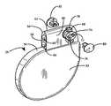 Referring next toFIG. 3, there is shown an isometric view of the first latchingmember80 shown inFIG. 2. It is seen to comprise a molded plastic part having ahead member84 in the form of a oval disk with a slightlyconvex face86 and generallyflat base88. Integrally formed with thehead member84 and projecting generally perpendicular from the base88 arelegs90 and92. Thelegs90 and92 have a somewhat flatouter surface94 with radiused side edges96 and98. Projecting outward from thesurfaces94 at the end of each of the legs is aprotuberance100 and102. Also rising from thesurface94 of each of the legs is a series of elongated knobs as at104. Anaperture106 is formed through the thickness dimension of thehead84 at the center thereof and longitudinally aligned with this aperture and projecting inwardly from each of thelegs90 and92 arelatches108 and110 (FIG. 5).