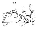 Aseat144 is mounted on a rearward intermediate portion of thelink140. Theseat144 is sized and configured to support a person in a sitting position. As shown inFIG. 4, theseat144 moves through a generally elliptical path P as thecrank discs120 and121 rotate. Those skilled in the art will recognize that the elliptical path will have a relatively smaller minor axis as the tracing point moves closer to therear rocker link150, while the major axis will remain approximately the same.
