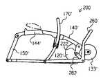 By pushing on thehandlebars170 and/or pulling against thefoot straps316 at the appropriate time, a person can encourage theseat144 to move upward and forward over center, and thus, these components may be described as means for encouraging upward and forward movement of the seat. Various other “means” may be used to help a person get theseat144 up and over center at the beginning of an exercise session. For example,FIG. 5 shows afoot platform link260 having an upper, forward end that straddles theflywheel133′ to support a person's feet on respective sides of theflywheel133′. An opposite, lower, rearward end of thefoot platform link260 is forked, and pivotally connected to respective sides of the frame at the same pivot axis as thehandlebar170′. Opposite, intermediate portions of thefoot platform link260 are pivotally connected to respective sinking cranklinks262, which in turn, are pivotally connected to thecranks120′. For purposes of operational clearance, arigid crank extensions222 are secured torespective cranks120′ at the pivot joints for theconnector link140′, and extend to the pivot joints for respective sinking cranklinks262. As a result of this arrangement, rotation of thecranks120′ is linked to pivoting of thefoot platform260, and a user may press against the upper end of thefoot platform260 to help move theseat144 “over center” along its elliptical path.