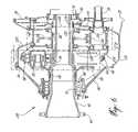 Thegearbox130 is also preferably a two stage reduction gearbox with an offsetfirst stage128. Referring toFIGS. 6–7, thefirst stage128 is composed of aninput pinion144 coupled to thedrive shaft38 and meshing with two idler gears145. The twoidler gears145 are then meshed with a first stage gear, or mating gear,146 which is coaxial with theoutput shaft40. Thegears144,145 and146 are also double helical gears. Thefirst stage128 is supported byfront bearings148 which are attached to asupport housing150 mounted into thegearbox housing132, and byrear bearings152 which are attached to thegearbox housing132.