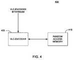 In some embodiments, the apparatus hereof (e.g., apparatus200) may be coupled to or interfaced with other devices and components in a VLC-decoding system. For example,FIG. 4 illustrates anexemplary system400 for decoding a VLC-encoded bitstream. VLC-decoder405 may decode the bitstream input thereto in accordance with the VLC-decoding methods disclosed herein. Random access memory (RAM)unit410 may be provided to store a lookup table. The lookup table stored inRAM unit410 may be populated by residual codewords generated by VLC-decoder405, in accordance with some embodiments herein.
