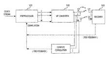 The upconverter330 receives the precoded and preprocessed symbol streams and modulates a carrier signal for transmission from the M transmission antennae T1, T2 . . . TM. Up converter configurations are well known in the art of communication systems.