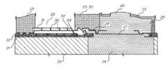 DETAILED DESCRIPTION OF THE INVENTIONAs illustrated with approximately 3000× magnification inFIG. 1 and other relevant drawing figures, a single inkjet nozzle device is shown as a portion of a chip that is fabricated by integrating MEMS and CMOS technologies. The complete nozzle device includes a support structure having asilicon substrate20, a metaloxide semiconductor layer21, apassivation layer22, and a non-corrosive dielectric coating/chamber-defininglayer23.