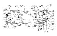 The spring means131 is secured to the first and second ends123 and124 of the tubular member by suitable means such as Dacronpolyester suture material146 which is utilized for sewing the spring means onto the tubular member. This can be accomplished by a sewing operation with thesuture material146 extending into and out of thewall126 of the tubular member and in whichknots147 are formed on each of the legs or struts137 and138 in such a manner so that the apices lying in theplane141 extend outwardly and are spaced from the end on which they are mounted and in which the apices lying in theplane142 extend just beyond the outer edge of the tubular member and in which the apices in the third plane are positioned inwardly from the outer edge.