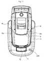 FIG. 3 is a front view schematically showing a portable charger for a mobile phone according to an embodiment of the present invention.FIG. 4 is a right side view showing the portable charger for a mobile phone with a belt clip in a non-operational position.FIG. 5 is a right side view showing the portable charger for a mobile phone with the belt clip in an operational position.FIG. 6 is a longitudinal section taken along line A—A ofFIG. 3 with a secondary battery and a charge control circuit removed therefrom.FIG. 7 is a rearward perspective view showing the portable charger for a mobile phone with the belt clip separated therefrom.FIG. 8 is a rearward perspective view showing the portable charger for a mobile phone with a coupling member is separated from the fastening member of the belt clip.FIG. 9 is a view showing the coupling member rotated by 90° clockwise and counterclockwise around the fastening member of the belt clip in the portable charger for a mobile phone according to the embodiment of the present invention.FIG. 10 is a view showing the electrical connection of a charging cable to the portable charger for a mobile phone according to the embodiment of the present invention and the mounting of a mobile phone in the portable charger for a mobile phone according to the embodiment of the present invention.FIG. 11 is a view showing the mounting of a mobile phone in the portable charger for a mobile phone according to the embodiment of the present invention and the charging of the battery of the mobile phone using the secondary battery.FIG. 12 is a view showing the portable charger for a mobile phone with a release button not operated and a rear housing removed therefrom.FIG. 13 is an exploded view of the portable charger for a mobile phone according to the embodiment of the present invention.FIG. 14 is a block diagram showing the control unit of the portable charger for a mobile phone according to the embodiment of the present invention.