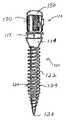 Referring now toFIGS. 6 and 7, another embodiment of the invention is disclosed.Pedicle screw100 has ahead110 and alower portion120.Head110 has a hexagonal cross-sectional shapedtop portion112 to facilitate in the insertion of the pedicle screw into the bone and/or cartilage. As can be appreciated, other shapes of the top portion can be used. As can also be appreciated, thetop portion112 can include one or more indentations, slots, ridges, openings, etc. to facilitate in the insertion of the pedicle screw into the bone and/or cartilage. Positioned below the hexagonal top portion is a conical shapedportion114 that terminated at thelower portion120 of the pedicle screw. The lower portion of the pedicle screw includes anouter surface122 that includesthread124. The cross-sectional shape of the lower portion is substantially circular and has a substantially constant cross-sectional shape and cross-sectional area throughout the majority of the longitudinal length of the lower portion. Theend126 of the lower portion as illustrated inFIG. 7 tapers to a point; however, theend126 can have a substantially flat configuration and/or have a non-tapering configuration. As can be appreciated, many other shapes and/or configurations of the head and/or lower portion can be used for the pedicle screw in the present invention.