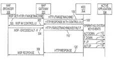 FIG. 3 depicts high-level messaging, in accordance with an illustrative embodiment of the invention, between a wireless-access browser, such as Wireless Access Protocol (WAP)browser308; a wireless-access gateway, such as Wireless Access Protocol (WAP)gateway310; theKES102; and theactive application104.WAP browser308 may run on a mobile terminal, such as a cellular telephone, a personal digital assistant, a handheld computer, and the like. The messaging between theKES102 and theactive application104 is essentially the same as the messaging between these elements discussed above in connection withFIG. 1.