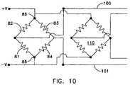 InFIG. 8 there is shown a cross sectional view of the semiconductor, pressure sensor depicted inFIG. 7. The semiconductor sensor has acentral boss80 which boss extends beyond the top surface of thesilicon wafer layer89. The piezoresistors as81,82,83 and84 are arranged in a Wheatstone bridge configuration as is well known. The bridge has contact areas which are depicted byreference numerals85 and86. There is shown athin interconnecting layer95 whichlayer95contacts areas91 and92 to provide direct contact to the terminals of the piezoresistive bridge. In this manner the bridge can be biased and the output voltage can also be obtained.FIG. 10 shows a relatively simple diagrammatic sketch wherein piezoresistors81 and82 are shown inFIG. 10 together withresistors83 and84 wired into Wheatstone bridge connection. The terminals for85 and86 receive bias voltage while the output terminals are directed to output leads100 and101. In a similar manner the next pressure transducer designated by numeral110 again receives bias voltage and has output leads. Thus thelayer95 is a connection sheet which serves to provide bias connections and output leads for the entire pressure transducer array. Thelayer95 is covered by athin plastic layer90 which has the imprint of the hand formed thereon. As seen all the bosses are again coupled or otherwise secured to aground plate86 which basically is a stationary plate which may be constructed from a rigid material. A pressure exerted upon the pressure sensor in the direction in arrow F depicted inFIG. 8 will cause a deflection of the transducer to enable an output voltage to be obtained. While the deflection plate is shown asplate86 and the interconnecting plate is shown asplate92 it is also understood that there are other ways of positioning the sensors between two plates. It is of course understood that the imprint of the hand can be impressed onplate86 and therefore when a person places his hand on the plate it would touch and depress thebosses80 of the various sensors giving rise to an output which is representative of all the sensors contacted. It is also understood that one can also have an imprint of the hand onplate90 which again will cause the diaphragms to deflect. In a similar manner the sensors can be arranged in a matrix which can be formulated by integrated circuit techniques on a single semiconductor chip taking the shape of various parts of the hand. It will thus become apparent to one skilled in the art that there are many ways for implementing the present invention. Essentially the present invention discloses a method for measuring tactical pressure when hand is placed on an instrumented plate. The plate consist of a metal or plastic surface which is covered with a thin interconnecting layer. A large group of very small pressure sensors are mounted to the interconnection layer. The apertures on the reverse side of the sensors as forexample apertures87 may be filled with a conductive epoxy or any other means to affix the sensors to the interconnecting layer. The sensors have bosses on the front surface. The height of the boss, as indicated, is slightly elevated with respect to the external surfaces of the sensor. Thus when a hand is placed on a plate it will touch and depress the bosses of the various sensors to provide an output which is representative of all the sensors that are contacted. One must be aware that there are many alternative embodiments which can be accommodated by the present invention and all are deemed to be incorporated within the spirit and scope of the present invention.