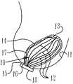 During manufacture the step of gathering together external ends15 can be accomplished, for example, wrapping with tape, fitting within tubing that can be heated and shrunk, containing within a hub or holding together with adhesive placed to allow fluid flow to pass. With respect to manufacture by adhesive holding, one way would be, for example, to peripherally join the external ends15 offibers12 so that passage of fluid can take place within, about, along, among and throughloose bundle17 and intocollector18. That is to say that the adhesive would essentially be peripherally surrounding gatheredexternal ends15 but would not restrain flow along, about, within and amongfibers12 inloose bundle17.
