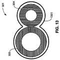 FIG. 13 illustrates a cross-section of another embodiment of a proximal catheter shaft according to the present invention across line C—C ofFIG. 3. Specifically,FIG. 13 illustrates ajacket1301 surroundingsupport wire shaft303 andinflation shaft304.Jacket1301 maybe used to couple (bond)support wire shaft303 andinflation shaft304 together, throughoutproximal portion330 ofcatheter301 For example, for an approximately 100–135 cmlong catheter301,jacket1301 preferably extends for approximately 70–80% of its proximal length. It is anticipated that even if the coupling were to extend for a much smaller portion, for example, 5–10 cm, the coupling effect provided is still beneficial to the user in terms of added torquability and steerability.