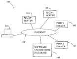 DETAILED DESCRIPTIONReferring now of the drawings,FIG. 1 depictssystem100 according to embodiments of the present invention.System100 comprises user system101 (e.g., a personal computer, personal digital assistant, Internet appliance, wireless communication/computing device) that executes a software application locally. The software application may advantageously be associated with a unique identifier.System101 may further create and update a suitable data structure to maintain a record of the use of the software application as will be discussed in greater detail herein.System101 may, from time to time, communicate the data structure to one ofproxy servers103. The communication of the data structure to one ofproxy servers103 may occur by selecting an Internet Protocol address (or other suitable address or identifier) from a cache of such addresses which is periodically updated as discussed in U.S. patent application Ser. No. 10/368,310, entitled “SYSTEMS AND METHODS FOR OPERATING A DIGITAL RIGHTS MANAGEMENT SERVER.” The one ofproxy servers103 that receives that data structure may forward the data structure to softwareuse database server104.System101 may also, from time to time, send a query or request to one ofproxy servers103 to obtain all software use data structures satisfying a particular criteria (e.g., that match the unique identifier). Theproxy server103 may then obtain that information from softwareuse database server104 and return that information tosystem101. Upon receipt of that information,system101 may examine the received data to determine whether the use of the software application has occurred according to licensing terms. If not, appropriate action may be taken (e.g., further execution may be blocked).