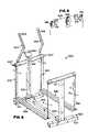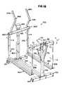 Each of tworails1430 has a front end which is pivotally mounted to theframe1420 at a first elevation above thefloor surface99. Therails1430 pivot about anaxis1481 relative to theframe1420. The rearward portion of eachrail1430 may be supported by a force resistance cylinder, a roller, a crank, or any other suitable part. A foot support orskate1480 is movably mounted on an intermediate portion of eachrail1430. The foot supports1480 are interconnected by acable1488 which extends about apulley1408 rotatably mounted on theupright1421.Springs1480 are placed in series with thecable1488 to keep thecable1488 taut while also allowing sufficient freedom of movement during operation.