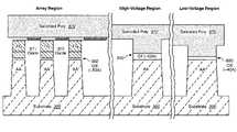 Memory cell arrays may be formed on the same silicon substrate with other circuits to form a memory system. For example, peripheral circuits may be formed on the same chip as the memory array to form a memory unit as shown inFIG. 2. Peripheral circuits may include charge pumps, sense amplifiers, input/output circuits, row decode circuits, clock circuits, registers and logic circuits. Some components may handle higher voltages than others. For example, charge pumps may produce voltages of 20 volts, while logic circuits may only deal with voltages of 1.5 volts. Therefore, the gate dielectric thicknesses required for devices in these components may be different. A charge pump may require a much thicker gate dielectric layer than a logic circuit. Thus, in some examples of memory systems formed on a semiconductor substrate, it may be desirable to form oxide layers of different thicknesses on different regions of the substrate. Circuits may be divided into high-voltage, mid-voltage and low-voltage circuits. In NAND systems, operations may include read, program and erase. A read operation may be performed using less than 5 volts and may be managed by a low-voltage or mid-voltage circuit. A program operation may use approximately 20 volts for programming (using high-voltage circuits) and approximately 7 volts for inhibiting (using mid-voltage circuits). An erase operation may use approximately 20 volts (using high-voltage circuits). In peripheral circuits, it is desirable to use thin gate oxide, particularly for logic operation.FIG. 2 shows a low-voltage region that includes peripheral circuits including logic and input/output (I/O) circuits. A mid-voltage region includes a read pump (a charge pump used for generating voltages used for reading). A high-voltage region includes two charge pumps used during programming. In addition, a memory cell array may be treated as a separate region. Adjacent to the memory cell array are the row decoder and sense amplifier (S/A) circuits. The row-decoder is typically in a high-voltage region while sense amplifiers may be in a low-voltage region.