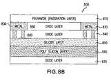 FIG. 8billustratesfuse800 having polyamide layer810 (also referred to as passivation layer),metal layer830 andoxide layer840,silicide layer850, poly-silicon layer860, and anoxide layer870. Normally,metal layers830 conduct through poly-silicon layer860 andsilicide layer850. Application of current to fuse800 (i.e., to metal layer830) meltssilicide layer850 to disrupt the conductive path through the poly-silicon layer860 andsilicide layer850.