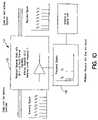 The geometry is chosen to match impedance with the cabling108 from theantenna controller104. In the equivalent circuit of a transmission line, there is capacitance, reactance, and resistance. Thecable coupler120 has a variable inductive property to it that is used to modulate a portion of the carrier signal. The variable inductive property is modulated by the data to return back to theantenna controller104. Thetransmission coil126 effectively adds a lump reactance whose reactance value depends on the instantaneous current in thetransmission coil126. As the current varies, the reactance changes. This varying reactance pushes and pulls part of the carrier energy in thecabling108. The effect is some level of FM modulation in the F0carrier. The frequency and level of current in thetransmission coil126 are selected to modulate a small portion of energy distinctly fromother antenna segments106 on thesame cabling108. This way, some number ofother antenna segments106 may communicate with theantenna controller104 at the same time without collision. After modulation, F1, exists at some level below F0, as shown inFIG. 9.Antenna segments106 may share the same frequency or have distinct frequencies.