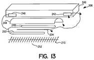 Light fixture206 may be comprised as shown inFIG. 13.Light fixture206 is shown comprisinglight fixture housing240.Light fixture housing240houses antenna segment204,antenna segment electronics242,light reflector244, lightfixture power supply246,fluorescent tubes248 and250, andlight diffuser252.Light reflector244 may be metallic and serve to capture the backside light fromfluorescent tubes248 and250 and then to redirect that light downward as usable light.Light diffuser252 then spreads the light (both the direct light and the reflected light) into a pattern of illumination, such asradiation pattern208.Antenna segment204 may be embedded inlight diffuser252. Similarly,indicators210 may be embedded inlight diffuser252.