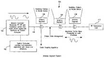 By way of another example, anantenna segment106 may be designed without coils by using only electronics and a wideband radio repeater based protocol approach.FIG. 10 shows a block diagram of anantenna segment107 using only electronics. In this example, the cabling108 from theantenna controller104 terminated into thefirst antenna segment107. Anelectronic circuit130 decodes the modulation. The packet address is examined. If the address belongs to anotherantenna segment107, the packet is retransmitted by aradio repeater132 on to thenext antenna segment107 down thecabling108. This approach introduces a time delay due to the decoding and recoding pass through packets.