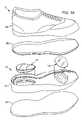The line FS inFIG. 2A, which will be referred to as footstrike line FS, illustrates the line of maximum pressure applied by the foot of a wearer to a shoe sole during running by a person whose running style begins with footstrike in the lateral heel area (rear foot strikers). The line FS is a straight line generalization of the direction that the line of maximum pressure follows for rearfoot strikers. The actual line of pressure for a given footstrike would not be precisely along straight line FS, but would generally follow line FS. As seen in this Figure, footstrike line FS starts in the lateral heel area, proceeds diagonally forward and towards the medial side as it proceeds through the heel area (pronation), turns in a more forward direction through the forward heel and arch areas, and finally proceeds through the metatarsal, metatarsal head and toe areas, with the foot leaving the ground (toe off) adjacent the area of the second metatarsal head.