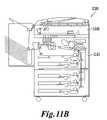 FIG. 11B illustrates the internal mechanical and electrical-mechanical components of thedocument processing center1100. In this Figure, thescanner unit1140 is mounted on top of theprinter unit1141, although any desired configuration or arrangements of the elements of theprinter unit1141 and thescanner unit1140 may be utilized. For example, theprinter unit1141 and thescanner unit1140 may be physically separate from each other.