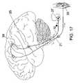 Vagus nerve stimulation, as performed by the system and method of the current patent application, is a means of directly affecting central function. As shown inFIG. 17, nerves have both afferent pathways19 (inward conducting nerve fibers which convey impulses toward the brain) and efferent pathways21 (outward conducting nerve fibers which convey impulses to an effector). The vagus nerve is composed of somatic and visceral afferents and efferents. Vagus nerve is composed of 80% afferent sensory fibers carrying information from the head, neck, thorax, and abdomen to the brain. The sensory afferent cell bodies of the vagus reside in the nodose ganglion and relay information to the nucleus tractus solitarius (NTS). Usually, nerve stimulation activates signals in both directions (bi-directionally). It is possible however, through the use of special electrodes and waveforms, to selectively stimulate a nerve in one direction only (unidirectionally). The vast majority of vagus nerve fibers are C fibers, and a majority are visceral afferents having cell bodies lying in masses or ganglia in the skull.