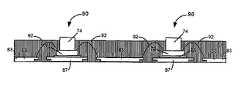 As shown inFIGS. 6A and 6B,material74 is applied over a central portion of eachIC72 leaving the perimeter of the IC (the area in which the bonding pads are formed) uncovered. Curable material can be applied using any appropriate technique. In someembodiments material74 is applied using screen printing techniques that are known to those of ordinary skill in the art while inother embodiments material74 is applied using a dispensing technology, for example using a computer controlled syringe or jet dispensing technology, that can dispense one or multiple droplets of the material as necessary as is also known to those of ordinary skill in the art. In some embodiments,curable material74 is applied in a square or rectangular shape. In other embodiments, it may be a circular or oval shape or a combination of various shapes.