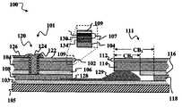 A further method for avoiding shorts involves deposition of a thin layer of insulating material on top of theactive layer107 prior to deposition of thetransparent conducting layer109. This insulating layer is preferably several microns thick, and may be in the range of 1 to 100 microns. Since it is deposited only over the area where a via is to be formed (and slightly beyond the borders of the via), its presence does not interfere with the operation of the optoelectronic device. This layer is similar to structures described in U.S. patent application Ser. No. 10/810,072 to Karl Pichler, filed Mar. 25, 2004, which is hereby incorporated by reference. When a hole is drilled or punched through this structure, there is a layer of insulator between thetransparent conducting layer109 and thebottom electrode104 which may be relatively thick compared to these layers and to the precision of mechanical cutting processes, so that no short can occur.