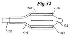 FIG. 32 is a side elevational view of an embodiment of the invention wherein the sheath is disposed about a portion of a stent which is disposed about a portion of a balloon catheter.