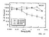 FIG. 13 is a graph depicting the in vitro effect of increasing concentrations of SL-11105 (●), SL-11124 (∘), and BE-333 (□) on the survival of cultured human breast cancer cells MCF7.