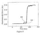 (2) Challenging the membrane or membrane adsorber device with a known concentration of a specific solute in the equilibration buffer. The selection of the specific solute is typically based upon its ability (or inability) to bind to the adsorber by a specific mechanism and its ability to be readily detected downstream (various chromophores for UV detection, fluorescently labeled solutes, etc.). The selection of the challenge solute concentration is typically based upon both the thermodynamic principles associated with solute adsorption (adsorption isotherm characteristics) and the specific objectives of the test. For example, if the objective of the test were to characterize the performance of a specific membrane adsorber device, one would select buffer and solute conditions and concentrations such that the solute binding characteristics to the membrane adsorber were within the linear part of the solute adsorption isotherm. However, if the objective of the test was to characterize the flow characteristics through only the membrane (thereby minimizing the effects of upstream dead volume) one would typically select buffer and solute conditions and concentrations such that the solute binding characteristics to the membrane adsorber were within the non-linear part of the solute adsorption isotherm.