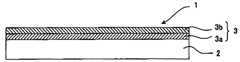 The barrier layer of this embodiment will be explained with reference to the drawings. As shown inFIG. 3, abarrier film1 comprises abase material film2, and abarrier layer3 formed on one side surface of thebase material film2. The above-mentionedbarrier layer3 comprises awater repellent layer3b, adense layer3aformed on thewater repellent layer3b, and awater repellent layer3bformed on thedense layer3aso as to provide a laminated structure with the above-mentioned three layers laminated.