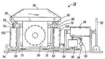 Referring toFIGS. 5 and 6, theblock plate99 is movably supported within aguide frame88.Guide rollers78 positioned betweenblock plate99 and theguide frame88 restrict theblock plate99 to only vertical movement within theguide frame88. Theblock plate99 and itscap98 are supported on theguide frame88 byhydraulic cylinders100.