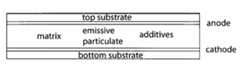 FIG. 35 illustrates a step in the inventive method of making a photo-radiation source, showing the addition of a transparent top substrate with transparent top electrode over the emissive particulate/matrix mixture. At least one of the first electrode and the second electrode may be transparent to photo-radiation in a photo-radiation spectrum effective for the selective polymerization of photo-radiation-curable organic material. The first electrode and the second electrode can be planar and disposed on flexible substrates. The top substrate and the top electrode may be transparent, with the electrode material being indium tin oxide, a conjugated polymer, or other transparent conductor. The top substrate material can be polyester, glass or other transparent substrate material.