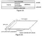 FIG. 33 illustrates a step in an embodiment of the inventive method of making a photo-radiation source, showing the step of the addition of an emissive particulate/matrix mixture onto a bottom substrate with bottom electrode;