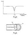 The parameters of thehelical coil521 that affect its resonant frequency include the diameter of the wire material used to form the coil, its diameter, pitch and overall length. These parameters are chosen such that the coil has its resonant frequency effectively at the operating frequency of the signal applied to the electrodes. For a 2.47 GHz operating frequency (and a free-space wavelength of approximately 121 mm), a resonator coil was employed having an approx coil length of 13 mm, a pitch of 5.24 mm, outer diameter 5.43 mm, wire diameter of 0.23 mm, and overall wire length of 41.8 mm. This gives a coil with a resonant frequency of approx 2.517 GHz (the difference allowing for the different speeds of propagation of e/m radiation in air and quartz respectively).