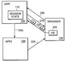 At200, thebrowser130 establishes a browser session with the originatingserver process100 throughcommunications205 inFIG. 2A, resulting in generation of asession state110. Thesession state110 may include communication resources that are allocated for a browser session and/or any application-specific information. Thesession state110 may be updated during the browser session as needed.