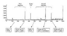 Referring toFIG. 26, a model of the amount of change between frames using a color histogram difference technique for an exemplary 1,000 frame video baseball clip is shown. The peaks typically correspond to scene cuts. The system may detect a pitching scene at around frame170. In this particular video clip the batter did not swing, and after the catcher caught the ball, there is a scene cut at frame322. Accordingly, a first segment may be defined from frame170 to frame322. After the pitcher was ready for another throw, the camera was switched back resulting in a scene cut at frame428. A new pitching scene was detected at frame520. This time the batter hit the ball, and the camera was switched to follow the flying ball which resulted inscene cut 2. In this case, the play continues, until another scene cut (scene cut 3) when the current play ends and another camera break occurs. As it may be observed, the scene cut (1) properly identifies the end of the first segment in the first pitching scene, while the scene cut (2) does not properly identify the end of the second segment in the second pitching scene. Accordingly, for a more accurate representation of the play it is desirable to distinguish between scene cuts where the play continues and scene cuts where the play ends or has ended. To make this determination, the present inventors determined that most scene cuts where the play continues occurs when the camera is still looking primarily at the field. In this case, the play should continue until a scene cut occurs where the camera is not looking at the field. If after the scene cut the camera is not looking at the field, then the current play ends. The field may be detected in any manner, such as the frame having sufficient generally green or generally brown colors. A flow chart of the technique for detecting the end of a play is shown inFIG. 27.