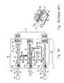 FIG. 5 illustrates in a simpler way the routes from terminals A7/A8 to terminals B7/B8 that are described above. The transmission line (i.e. A7/1 and A8/1 to/from B7/1 and B8/1) comprises several subsections, each of which having essentially a different characteristic impedance caused by having a strip line with different width. InFIG. 5, subsections A8/1→A8/2 (layer40/A) and B8/2→B8/1 (layer40/A) consist of 12 mili-Inch strip lines (i.e. narrower than 0.01λ). Subsections A8/2→contact8 in row A of switching module14 (layer C) andcontact8 in row B of switchingmodule14→B8/2 (layer B) consist of 8 mili-Inch strip lines (i.e. narrower than 0.01λ). Similarly, the route from terminal A7/1 to B7/1 consist of 12 and 8 mili-Inch (i.e. narrower than 0.01λ) width subsections.