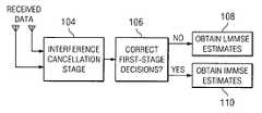 SUMMARY OF THE INVENTIONTo meet the above and other objectives, the present invention provides a receiver that predicts performance of and selects between iterative and non-iterative decoding of symbols based on an intelligent metric. Based on a pre-specified criterion, the receiver determines if a correct first-stage decision is made or not. If a correct decision is made, then it follows iterative processing like in BLAST. Alternatively, if a wrong decision is found to have occurred, the receiver resorts to LMMSE estimation processing.