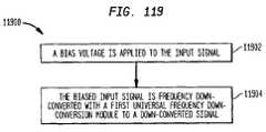Instep11904, the biased input signal is frequency down-converted with a first universal frequency down-conversion module to a down-converted signal.