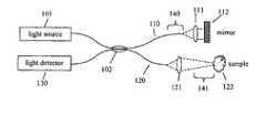 Referring toFIG. 1, significant mismatch in optical dispersion can be introduced by the choice of lengths of optical paths in fiber and air. Consider the case whenfiber110 is 100 mm longer thanfiber120, but thelenses111 and121 are of substantially the same thickness. The extra length offiber110 is indicated bylabel140. Consider for simplicity the situation when the region of interest in the sample is close to the surface, so that there is negligible chromatic dispersion within the sample. The extra optical path length due to thelonger fiber110 can be balanced at a particular optical frequency by placing approximately 150 mm more optical path in air in the sample path than in the reference path, indicated bylabel141. The exact path length in air can be adjusted so that the sample and reference optical path lengths match for the optical frequency at the center of the spectrum of the source.