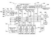 The elements of theDSP110 are interconnected by buses for efficient, high speed operation. Each of the buses includes multiple lines for parallel transfer of binary information. A first address bus150 (MA0) interconnects memory bank140 (M0) andcontrol block124. A second address bus152 (MA1) interconnects memory bank142 (M1) andcontrol block124. A third address bus154 (MA2) interconnects memory bank144 (M2) andcontrol block124. Each of theaddress buses150,152 and154 is preferably 16 bits wide. An external address bus156 (MAE) interconnectsexternal port128 andcontrol block124. Theexternal address bus156 is interconnected throughexternal port128 toexternal address bus158. Each of theexternal address buses156 and158 is preferably 32 bits wide. A first data bus160 (MD0) interconnectsmemory bank140, computation blocks112 and114,control block124, link port buffers126,IAB132 andexternal port128. A second data bus162 (MD1) interconnectsmemory bank142, computation blocks112 and114,control block124, link port buffers126,IAB132 andexternal port128. A third data bus164 (MD2) interconnectsmemory bank144, computation blocks112 and114,control block124, link port buffers126,IAB132 andexternal port128. Thedata buses160,162 and164 are connected throughexternal port128 toexternal data bus168. Each of thedata buses160,162 and164 is preferably 128 bits wide, andexternal data bus168 is preferably 64 bits wide.