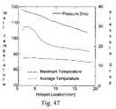 FIG. 47 illustrates the effect of hotspot location on temperature and pressure drop.