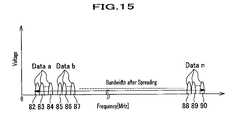 FIG. 15 shows a chart that shows a distribution of sub-carriers to which identically same data are allocated in spread spectrum of plural sub-carriers.