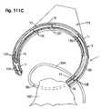 Referring now toFIGS. 109,109A,111-111C of the drawings, under circumstances where any of the driver mechanisms (not illustrated) described above are operated to effect movement of theneedle50 around the fixed way/case2, (as well as the alternate fixed way case15) theneedle50 is initially driven in the counterclockwise direction from the position illustrated inFIGS. 109 and 111 to the position illustrated inFIG. 111A and through material to be sutured100, which is positioned in the opening or gap5 (FIG. 109) spanning the advancingarm2A and the receivingarm2B of theunidirectional device1A (or the alternateunidirectional device1B, not illustrated). As theblade50 enters the material100 as illustrated inFIG. 111A the reciprocal driver8 (or thealternate driver7 or secondalternate driver7A) is incremented inside theneedle guide slot26 with each of the respectivedriver housing bosses10 traversing therespective notches6 lying adjacent to corresponding way/case blade housing bosses11 (FIG. 109A). Therespective driver blades12D thus engage theneedle50 in driving relationship. At this point, the driving mechanism is reversed to reverse thereciprocal driver8, or thealternate driver7, or the secondalternate driver7A, (not illustrated) and re-increment thereciprocal driver8 or the other drivers from the position illustrated inFIG. 111A back to the position illustrated inFIG. 109. This action leaves theneedle50 in the position as illustrated inFIG. 11A, due to the forward positioning of therespective driver blades12D andfixed way blades12E, that prevent reverse-rotation of theneedle50. When the reciprocal driver8 (or thealternate driver7 or the secondalternate driver7A) is re-incremented by the driving mechanism into driving mode, illustrated inFIG. 109, thosedriver blades12D (or thedriver blades15G or the alternate driver blades15GGG) contacting theneedle50 again grip theneedle50 and cause theneedle50 to increment forwardly into the position illustrated inFIG. 111B. Thereciprocal driver8, as well as thealternate driver7 or the secondalternate driver7A are then in the position illustrated inFIG. 111B, but with theneedle50 further incremented through thematerial100 and re-entering the receivingarm2B of theunidirectional device1. At this point, the reciprocal driver8 (or the alternative drivers) are then again re-incremented into the position illustrated inFIG. 109, where thedriver blades12D (or the other driver blades described above) contacting theneedle50 again grasp theneedle50 and force it around theneedle guide slot26 in the fixed way/case2 to the position illustrated inFIG. 111C, where it approaches a complete rotation through theunidirectional device1, with thethread50A (illustrated in phantom) also in position for pulling through the material100 as theneedle50 further increments around theneedle guide slot26 and across the gap5 (FIG. 109) of theunidirectional device1.