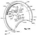 After the shuttle members return to their starting positions, actuation of thetrigger member1406awill once again cause clockwise movement of the shuttles along theshuttle track1413. As before, during this clockwise movement of the shuttle,elastomeric springs1442 will urgespring engaging members1440 into binding engagement with theneedle1422 in the manner illustrated inFIG. 200 causing the needle and the suture “S” to advance to a third, further advanced position (not shown). It is to be appreciated that by the repeated actuation and release of thetrigger member1406a, the suturing needle can be smoothly in controllably incrementally further advanced along theneedle guide1416 to efficiently complete the suturing operation.