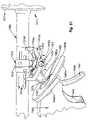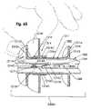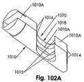 As further illustrated inFIGS. 139,140,141 and145-146 of the drawings theblades350A and350B are pivotally mounted incorresponding blade housings320A and320B and are each characterized byslots350C and350D, respectively, designed to transversely receive theneedle50. Pivot pins352A and352B extend downwardly from thelevers354C and354D, respectively, of thecorresponding blades350A and350B. In a preferred embodiment the short ends352C and352D (not illustrated) project from the slotted ends of thelevers354C and354D, respectively, for insertion under overhanging undercutledges354A and354B, respectively, provided in themovable segment overhang312D and312E, respectively, of therespective blade housings320A and320B of themiddle tube assembly320. Thepivot bearing holes322C and322D (not illustrated) respectively, are provided in therespective floors322A and322B of thecorresponding blade housings320A and320B between the upward-standingshelves320D and320E, respectively. In a preferred embodiment thepivot bearing holes322C and322D are each provided withramps322E and322F (not illustrated) respectively, to facilitate accommodation of therespective pivot pins352A and352B, for inserting therespective blades350A and350B into the correspondingpivot bearing holes322C and322D, respectively, while assembling the blades in thecorresponding blade housings320A and320B. Accordingly, when therespective blades350A and350B are assembled in thecorresponding blade housing320A and320B of themiddle tube assembly320 they are constrained to pivot on the corresponding pivot pins352A and352B, respectively, as illustrated inFIG. 146 (with respect to theblade350A), such that thecorresponding slot350C engages theneedle50 and allows rotational movement of theneedle50 in the corresponding discontinuousmovable guide way321 when theblade350B is positioned perpendicular to the curvature of theneedle50 in a radius of the upper middle tube portion320AB of themiddle tube assembly320. However, when theblade350A is pivoted in either direction as indicated by the arrow inFIG. 146, the edges of theblade350A along theslot350C engage theneedle50 and facilitate incrementation of theneedle50 in a driving direction and slippage of theneedle50 past theblade350A in the opposite direction, as hereinafter further described. In another preferred embodiment of the invention the discontinuousmovable guide way321 formed in theshelves320D and320E, respectively, as well as in the facing inside wall of therespective blade housings320A and320B, respectively, and the discontinuous fixedguide way312 in the fixedsegments310A,310B and310C, are provided with conical entrance guides312L to guide theneedle50 in its rotation around therespective blade housings320A and320B in the upper middle tube portion320AB and the corresponding fixedsegments310A,310B and310C of the arcuatetop section313D.