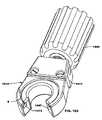 Referring now toFIGS. 120 and 122 of the drawings thehousing220 is positioned with theadjacent driver230 in functional relationship and with theneedle50 located in thetop face slots225A of the forkedblades225, as detailed inFIG. 120. Furthermore, therespective levers225D extend from the correspondingpivot shaft sections225B andbase sections225C of each forkedblade225, into therespective counterbore slots220E in thehousing220 and project into the corresponding,adjacent bearing slots230A of thedriver230. Accordingly, it will be appreciated that shifting of thehousing220 in either the clockwise or counterclockwise direction with respect to thedriver230 by manipulation of a suitable operator (not illustrated) causes the corresponding wall of thecounterbore slots220E and the corresponding bearingslot wall230G, projecting into the correspondingbearing slot230A of thedriver230, to contact and pivot each of thelevers225D. This action causes the corresponding diametrically-opposed sets of theouter lock points225F and inner lock points225G on the respectivecurved blade extensions225E to contact theneedle50 and facilitates a corresponding incrementation of theneedle50 by corresponding incrementation of thehousing220 and thedriver230 in the opposite direction, as hereinafter further described.