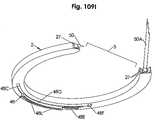 It will be appreciated from a consideration ofFIGS. 139-158 of the drawings that the tubular forkedblade device300 of this invention can be positioned in a desired configuration, typically as illustrated inFIG. 155 utilizing thecables396, to facilitate suturing of a material100 in substantially any suturing configuration. Furthermore, although the tubular forkedblade device300 can be operated by means of the mainmodular extension364, including theextension structure390, thedrive gear398 and thegapped gear398D illustrated inFIGS. 153-158 as noted above, other apparatus and techniques can be utilized to effect incrementation of thedrive spur330 to cause theblades350A and350B to contact theneedle50 in driving configuration and facilitate simultaneous driving of themiddle tube assembly320 and thedrive spur330 to effect the desired suturing, as illustrated inFIGS. 148 and 149. Furthermore, it will also be appreciated that although the arc of theneedle50 is fitted with the length ofthread50A at the center thereof, typically as illustrated inFIGS. 150-152 of the drawings, it is understood that thethread50A may be attached to either end of theneedle50 under circumstances where theneedle50 is to be driven in either the clockwise or counterclockwise direction, depending upon the positioning of theneedle50 in the tubular forkedblade device300. Moreover, insertion of theneedle50 in the respectivediscontinuous guide way312 of the fixedsegments310A,310B and310C, theway segments318A,318B and318C of the spring pressure pad assembly and the discontinuousmovable guide way321 in theblade housing320A and320B, is typically effected by deforming theneedle50 slightly by bending the needle points341A and341B toward each other to reduce the diameter of theneedle50 and facilitate installing it beneath the respective fixed segment overhangs312A,312B and312C, located in the corresponding fixedsegments310A,310B and310C and the movable segment overhangs312D and312E in theblade housings320A and320B. When so installed, theneedle50 receives a small amount of frictional resistance from the outside walls of the discontinuous fixedguide way312 and the discontinuousmovable guide way321 in themovable blade housing320A and320B. This resistance is a contributing factor in prevention of the needle from rearward rotation after being incremented in the forward direction responsive to re-incrementation of themiddle tube assembly320 and thedrive spur330 in concert by operation of the tube return spring398G (FIG. 156) as described above.